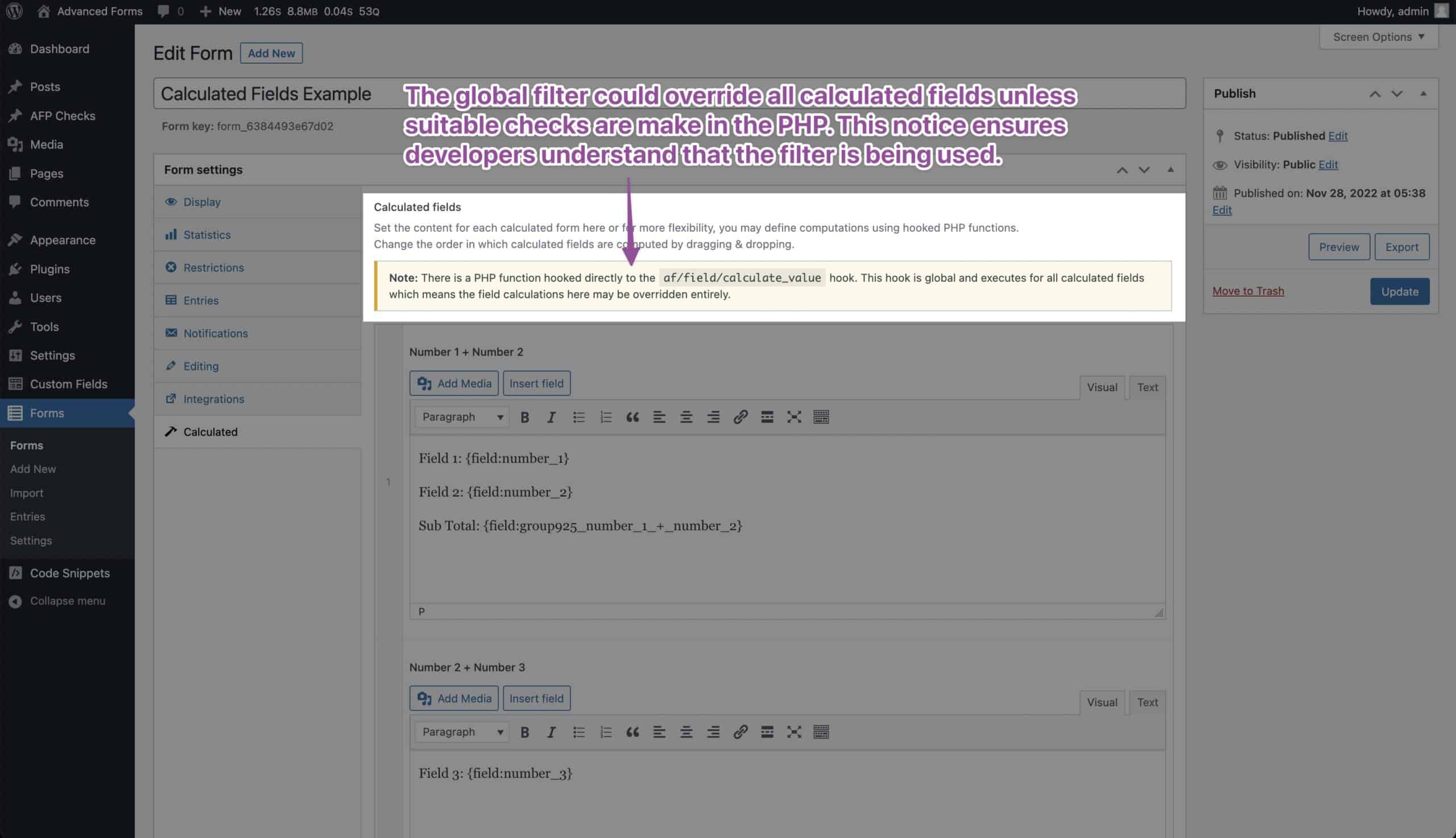 Additionally, if the global variant of the filter is in use — af/field/calculate_value — it could potentially modify and/or override all calculated fields. In this situation, a notice is shown above the calculated field settings stack.