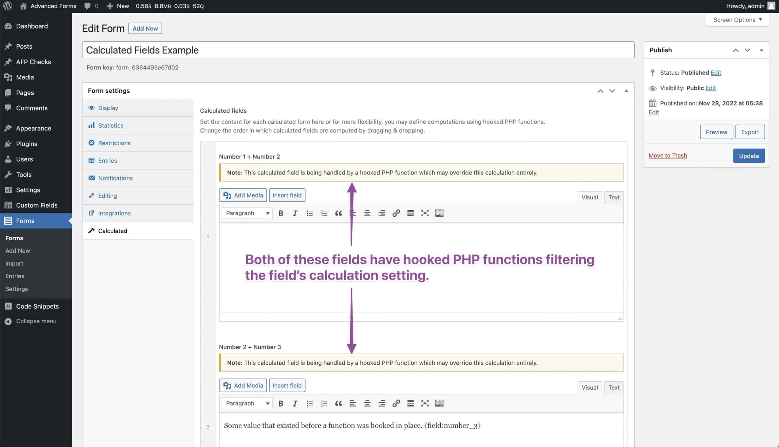 The field name and other field settings will no longer disappear when selecting the calculated field type in an ACF field group’s settings page. This allows full control to set and modify the field name that is used in both form merge tags and calculation PHP filter hooks.