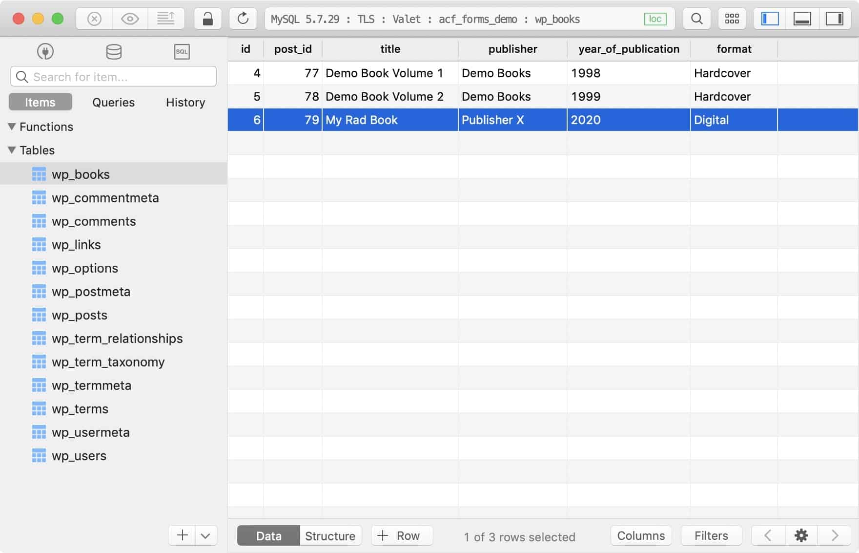 At this point, the database table is created and any book posts you create in the WordPress admin should be saving to the custom database table.